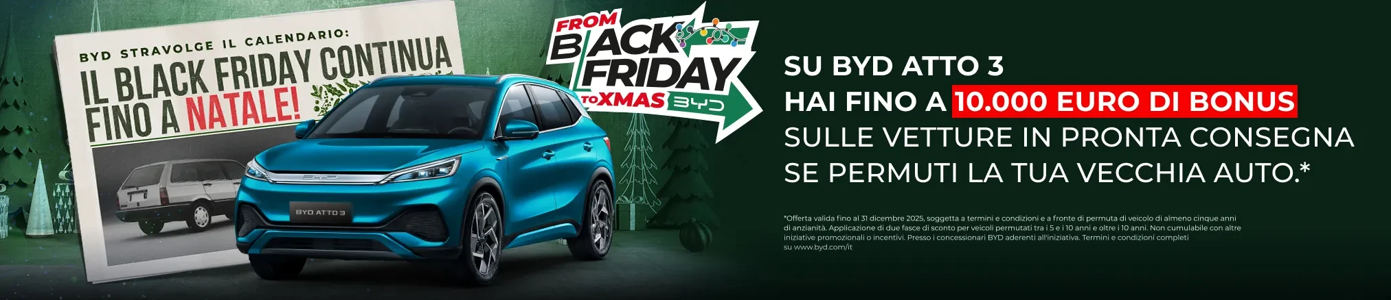 2- Dettagli offerta promozionale valida fino al 31.12.2025. Offerta di noleggio a lungo termine Byd Renting Business relativa a Byd Atto 3 Comfort 36 Mesi/45.000 Km totali . Il canone mensile di € 479 prevede anticipo € 3.500. Tutti i valori sono IVA esclusa. Il canone mensile include tagliandi, vernice metallizzata, manutenzione ordinaria e straordinaria, immatricolazione e messa su strada, RCA con massimale di €25.000.000 (penale € 250), infortunio conducente (PAI J - in caso di morte somma assicurata €40.000, invalidità permanente somma assicurata sino a €40.000 franchigia 3%). Limitazione di responsabilità per: - Danni accidentali (penale 500 €) - Eventi socio politici (penale 500 €) - Incendio e furto (penale 500 €) - Cristalli (penale 250 €) - Atti vandalici (penale 500 €) - Eventi naturali (penale 500 €), Traino e Assistenza 7/24. Offerta salvo approvazione da parte di ARVAL SERVICE LEASE ITALIA S.P.A. nonché alle variazioni di listino. Arval si riserva la facoltà di installare, a propria cura, un sistema di antifurto satellitare (GPS oppure altro sistema). Per tutti i dettagli rivolgersi ai Concessionari ufficiali Byd. La foto è inserita a titolo di riferimento. Le immagini dell’autovettura sono poste a mero titolo esemplificativo e potrebbero pertanto non essere perfettamente rappresentative delle caratteristiche specifiche del prodotto illustrato, che potrebbe essere differente ad esempio per colori e / o accessori, allestimenti, etc..